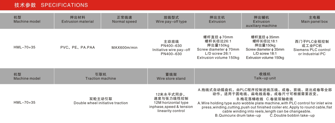 It is suitable for the production of special flower wires for automobiles, low-voltage ordinary wires AV, low-voltage thin-skin wires AVS, low-voltage ultra-thin wires AVSS, electron irradiation PVC low-voltage wires AVS, electron irradiation PE low-voltage wires AEX, low-voltage compression to body thin-skin CAVS, etc.